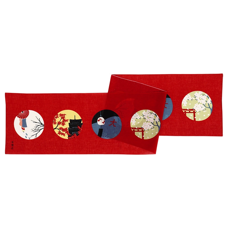 右から桜の春、大文字の夏、紅葉の秋、そして雪の中の冬。1枚で京都の四季を堪能できます。
