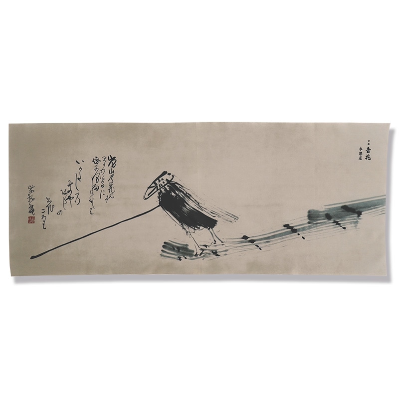 「嵐山乃花見に参りけるに にわかに風雨しぐれしを い可田し乃みのや 阿らしの花ころも」と詩が添えられています。 蕪村の繊細な筆致と情景表現を、手ぬぐいに再現しました。
